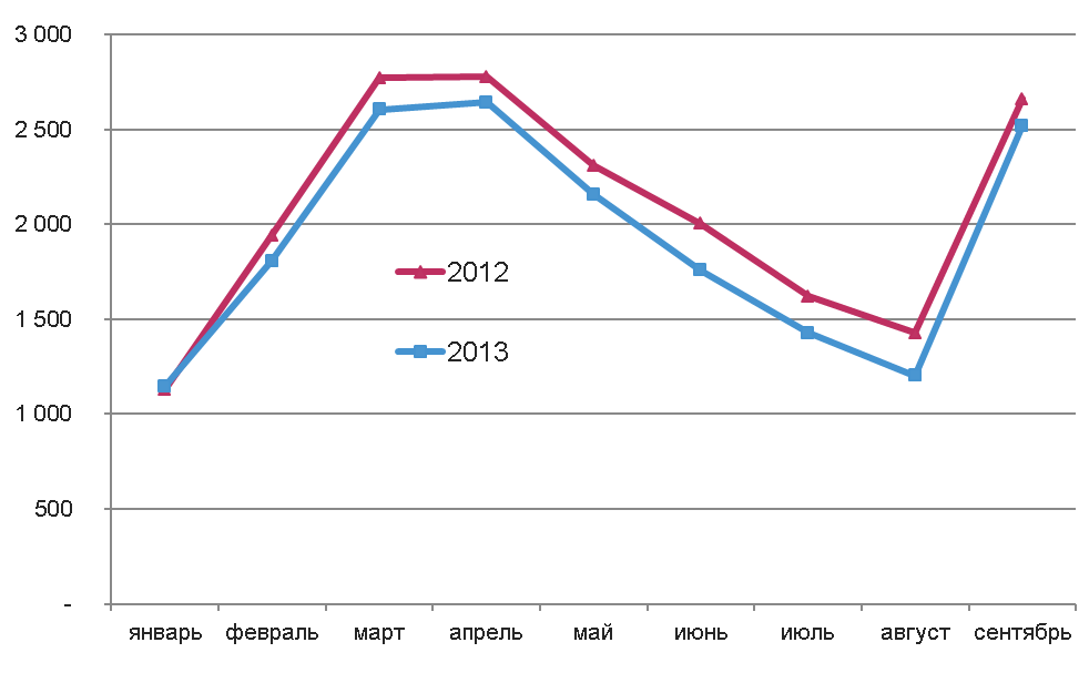 Доходы от рекламы изданий центральной прессы в январе-сентябре 2012-2013 гг., млн. руб. без НДС