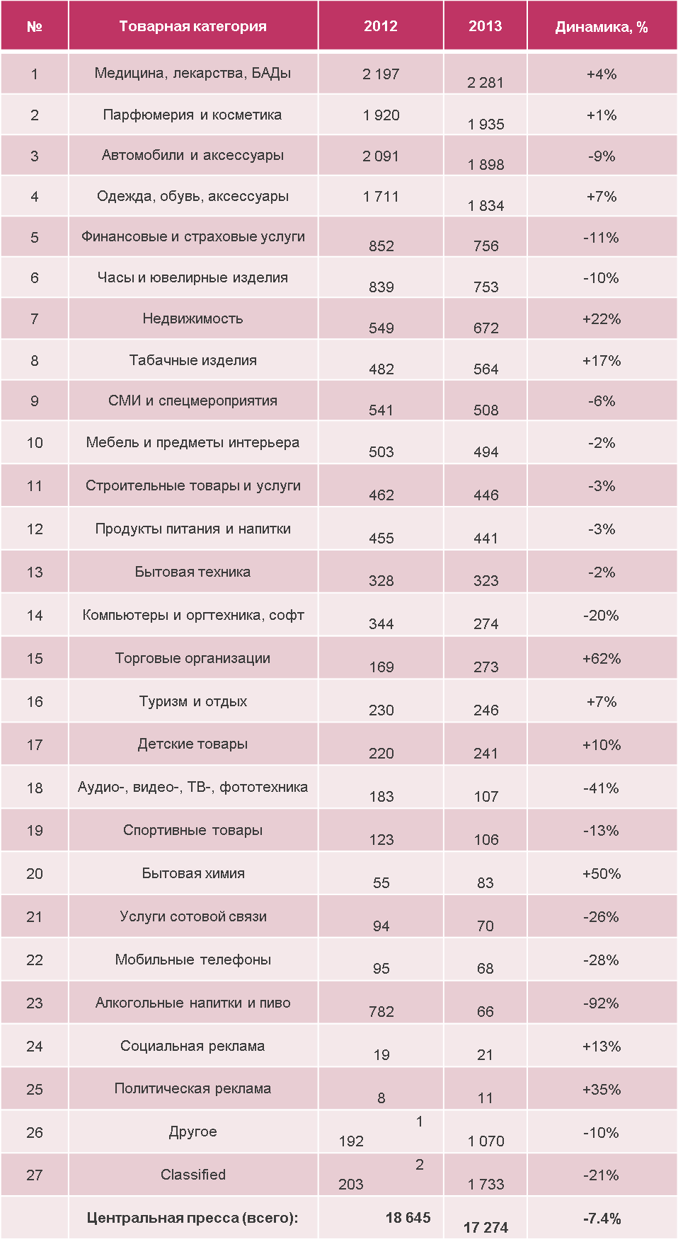 По результатам трех кварталов объем рекламы в центральной прессе снизился на 7%, при этом общая площадь рекламы сократилась на 16%. Показатель -7% для снижения объема сегмента в денежном выражении с большой вероятностью будет фигурировать и в качестве годового итога.