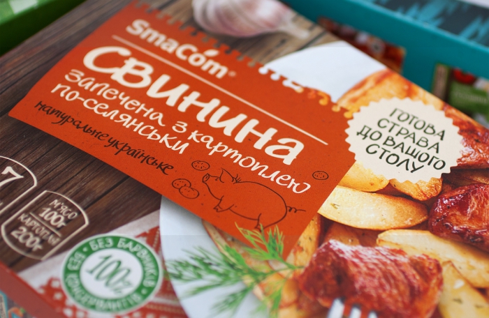 Этого креаторы добились за счет сервировка в стиле кантри с национальными элементами домашнего текстиля, свежего овощного антуража, рецептурной записки плюс ручной зарисовки. На первом этапе было разработано 7 SKU, в будущем планируется расширение продуктовой линейки готовых блюд SmaCom.