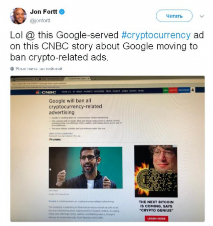 Однако пока нововведения не вступили в силу, и пользователи сети заметили рекламу криптовалюты в новостной статье CNBC о запрете криптоконтента Google.