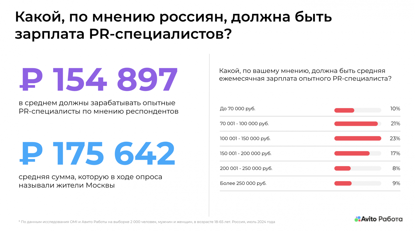 Согласно опросу, 23% россиян считают, что опытный PR-специалист должен получать зарплату от 100 тыс. 1 руб. до 150 тыс. руб. От 70 тыс. 1 до 100 тыс. руб. в качестве средней зарплаты для опытных PR-специалистов назвали 21% россиян. По мнению 17% респондентов, средняя зарплата PR-специалиста должна быть в диапазоне от 150 твс. 1 руб. до 200 тыс. 1 руб. Еще столько же россиян отметили, что достойная оплата труда для этих сотрудников составляет сумму свыше 200 тыс. руб. Только 10% опрошенных считают подходящим среднемесячный заработок PR-специалистов до 70 тыс. руб.