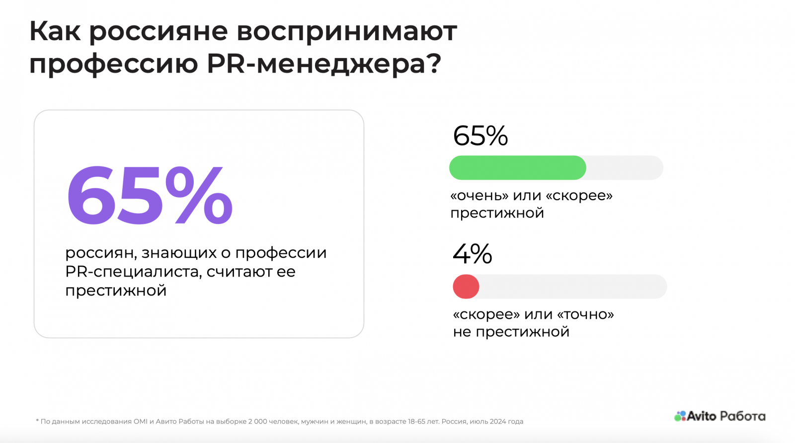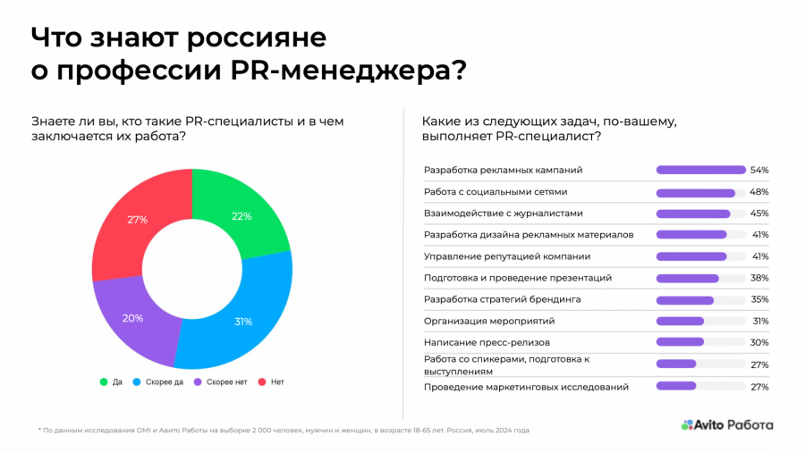 Результаты исследования показывают, что многие россияне все еще не до конца понимают специфику этой профессии, часто путая ее с рекламой, SMM или маркетингом. Так, респонденты ошибочно считают обязанностями PR-специалистов создание рекламных кампаний (54%), работу с социальными сетями (48%) и разработку дизайна рекламных материалов (41%).