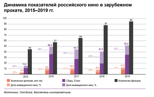 В 2019 году за пределами России в кинотеатрах вышли 94 отечественные картины, их посмотрели почти 12 млн человек, что почти в полтора раза больше, чем годом ранее. Кассовые сборы российских фильмов за рубежом за последние пять лет выросли в 3,5 раза, в прошлом году составив $52,4 млн, сообщается в исследовании Фонда кино.