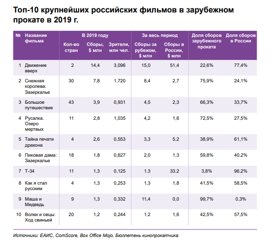 Самым кассовым российским фильмом в зарубежном прокате стала спортивная драма «Движение вверх», заработав $14,3 млн. Второе место занимает анимационная картина «Снежная Королева: Зазеркалье», третье — мультфильм «Большое путешествие» ($3,9 млн). В целом анимация принесла почти каждого третьего зрителя отечественным проектам.