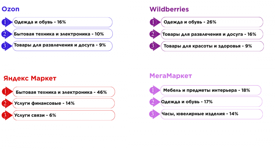 В топ-категорий на Ozon попали «Одежда и обувь», «Бытовая техника и электроника», «Товары для развлечения и досуга», на «Яндекс Маркете» — «Бытовая техника и электроника», «Услуги финансовые» и «Услуги связи», на Wildberries — «Одежда и обувь», «Товары для развлечения и досуга», «Товары для красоты и здоровья», на «МегаМаркете» — «Мебель и предметы интерьера», «Одежда и обувь», «Часы, ювелирные изделия».