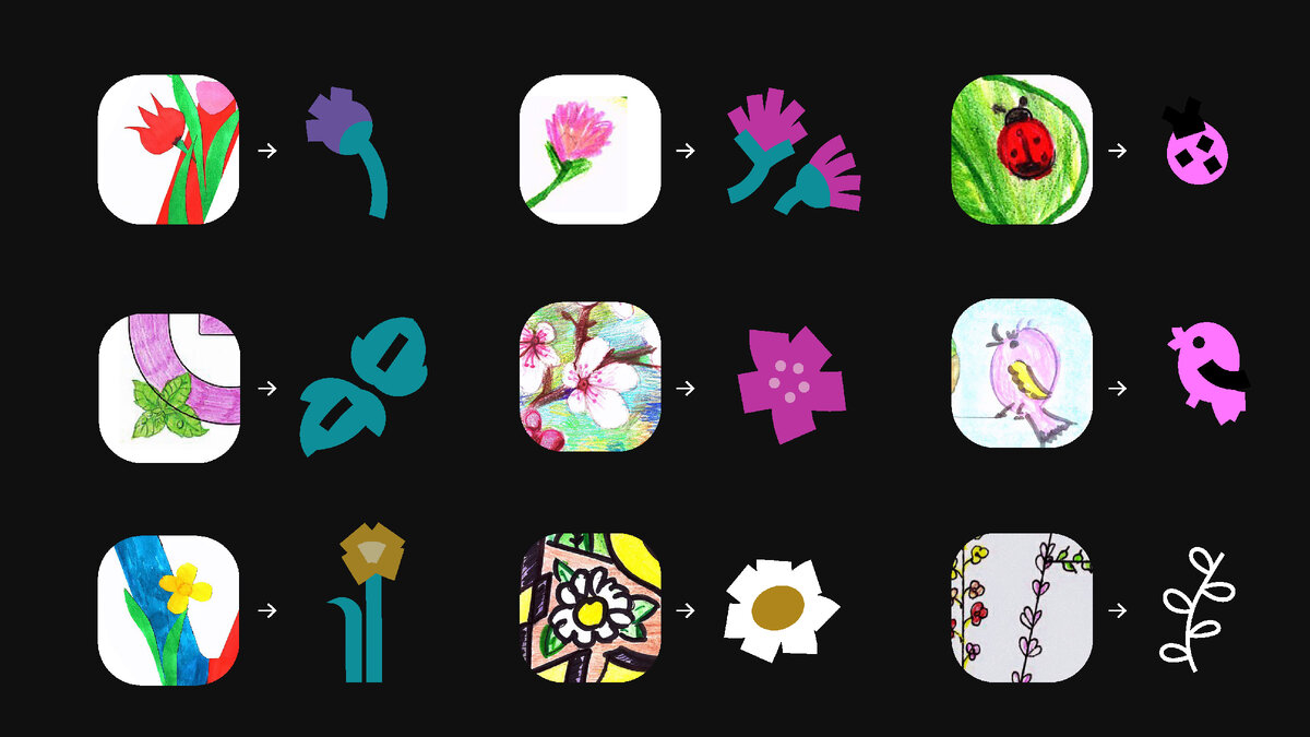 Разобрать все на кусочки — отличный подход. Он сохраняет ассоциацию с детскими рисунками и дает свободу вариативности. Мы можем создавать множество разных дизайнов, но стилистика при этом останется узнаваемой.