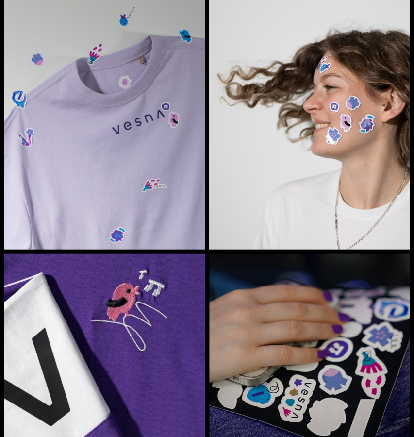 В первый дроп мерча вошли шопер, худи, стикерпак и носки. Чтобы усилить вовлеченность коллег, в марте 2024 года провели презентацию с благотворительной ярмаркой. На ней организовали выставку рисунков и собрали всех участников процесса: и детей, и дизайнеров, и остальных сотрудников VESNA.