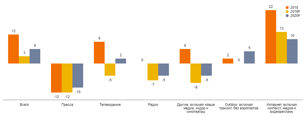 Таким образом, можно ожидать, что российский рынок рекламы, «исправляя диспропорцию», будет расти быстрее. А вот от отдельных каналов распространения рекламы неожиданностей ждать не приходится. Пресса продолжит падение, интернет — рост. Как обещают аналитики Zenith, в наступающем 2020 году отечественное телевидение покажет, наконец, рост бюджетов, а вот новые медиа и индор-реклама, наоборот, по темпам роста уйдут в минус.