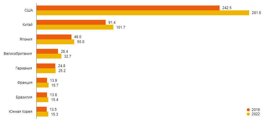 ТОП-8 стран по объему рекламных расходов, $млрд