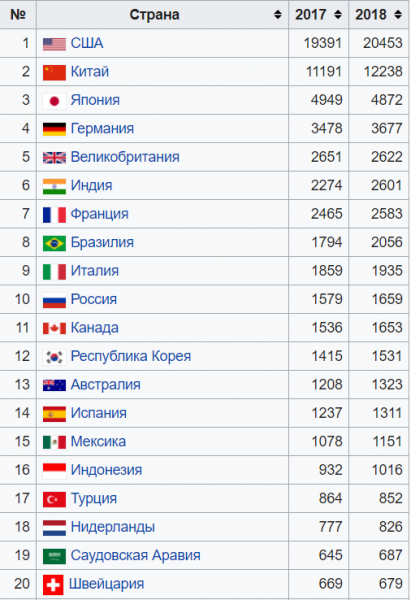 Между тем по уровню ВВП Россия занимает в мировых рейтингах более высокое место, чем по объему рекламного рынка. Приведенный нами ниже рейтинг составлен с учетом паритета покупательной способности национальных валют. Это позволяет учесть не только такие товары как нефть и газ, но и интеллектуальную собственность, производные финансовые инструменты, расходы на НИОКР и вооружение.