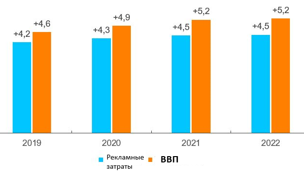 Дело в том, что отношение объема рекламного рынка к ВВП страны нестабильно и способно пусть медленно, но меняться. Согласно расчетам Zenith, в ближайшие три года глобальный рекламный рынок будет расти примерно на 0,7 процентных пункта медленнее, чем мировой ВВП.