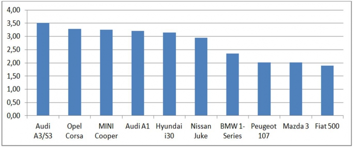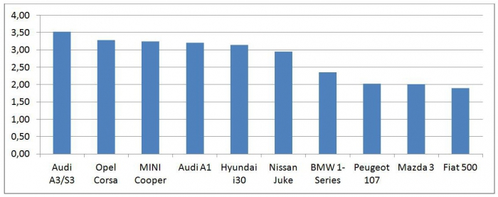 Автолюбители со средними доходами без разбивки по полу наиболее женскими марками считают Audi A3, Opel Corsa, Mini Cooper, Audi A1.