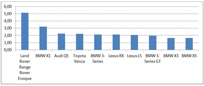 Чем выше доход, чем выше интерес автолюбителей к престижным маркам. В нашем случае группа с высокими доходами предпочитает считать «женским автомобилем» Range Rover Evoque, BMW X1, Audi Q5.