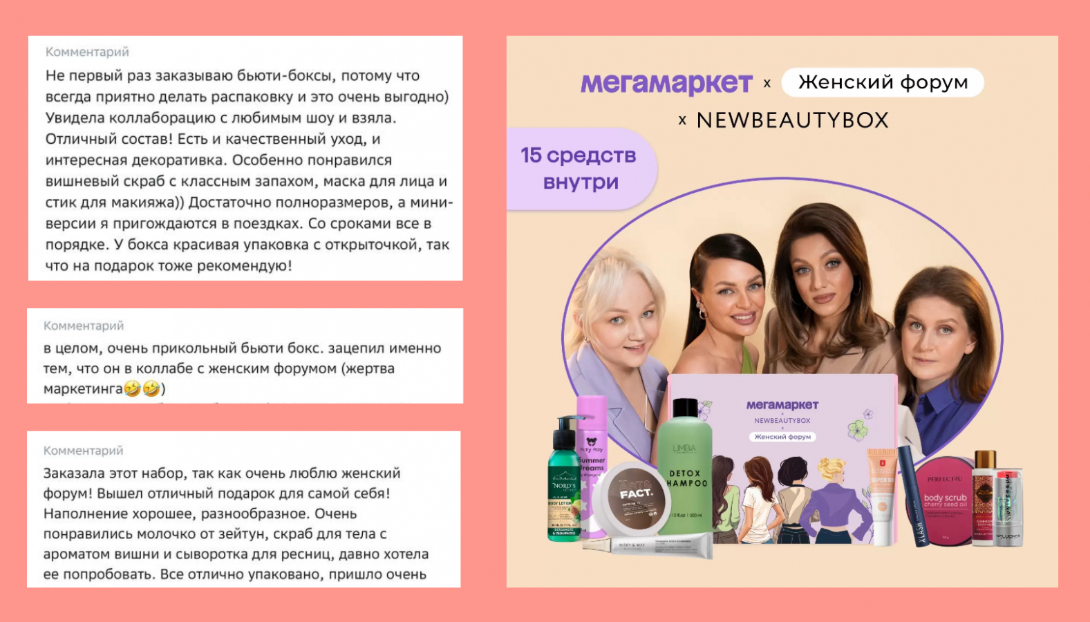 Коллаборации. За каждой публичной личностью стоит мощная фанбаза — люди, которым близка эстетика и философия знаменитости. Используя социальный капитал и узнаваемость инфлюенсера, позвольте ему творить свою магию. Тогда все останутся довольны: бренд получит узнаваемость, доверие и дополнительный инфоповод. Блогер тоже в плюсе — с гонораром и лояльным отношением подписчиков к рекламе. Примером коллаборации можно считать сотрудничество шоу «Женский форум» и «Мегамаркета» с собственным брендом бьюти-боксов.