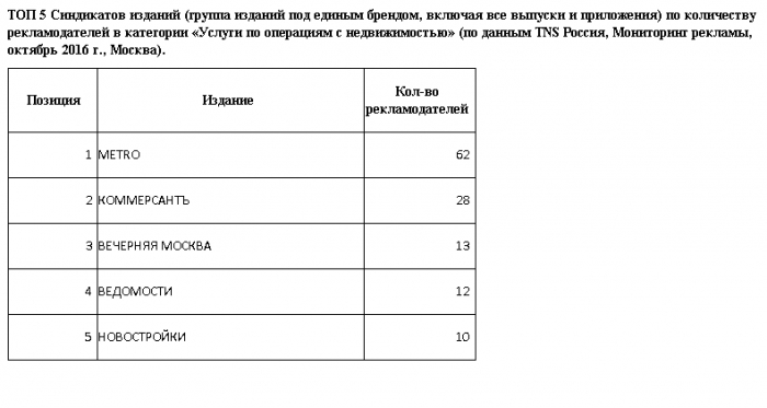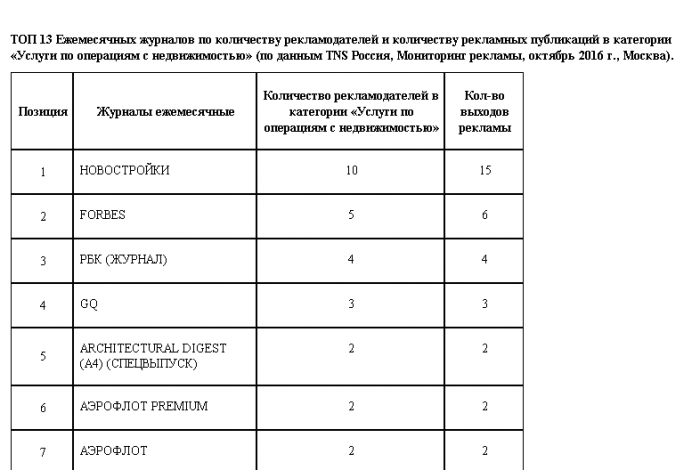 А в выборке ежемесячных изданий «Новостройки» занимают первое место по числу рекламодателей и количеству рекламных публикаций в категории «Услуги по операциям с недвижимостью». Общее количество выходов рекламы этой категории в осеннем выпуске журнала составило 15 единиц.