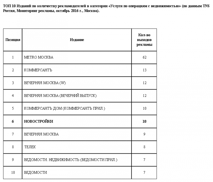 По итогам октябрьского мониторинга компании TNS России осенний номер журнала «Новостройки» находится на первом месте среди ежемесячных изданий по количеству рекламодателей и по количеству публикаций рекламы в категории «Услуги по операциям с недвижимостью».