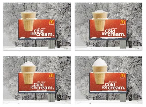 Первый из восьми экземпляров — дело рук сети ресторанов McDonald's. Необычный билборд, размещенный в Швеции, гласит: «Никогда не бывает слишком холодно для мороженого».