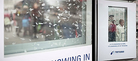 А вот в Осло в стенку атобусной остановки заключили настоящий маленький снегопад. Таким образом норвежские рекламщики информировали прохожих о погоде на склонах горнолыжного курорта Tryvann Winter Park.