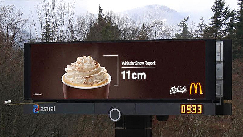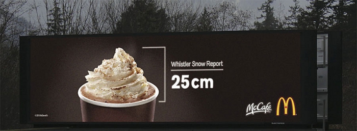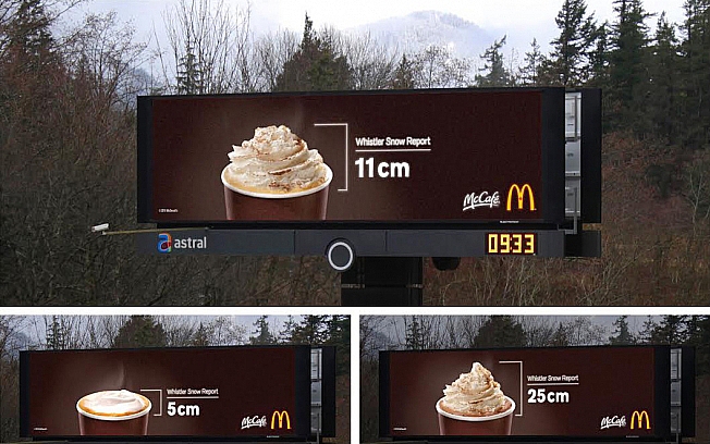 Еще один рекламный щит McDonald's в этом году взял на себя информирование водителей о погодных условиях близ кандского города Уистлер. А заодно и прорекламировал эспрессо. Уровень взбитых сливок на напитке отражает данные снегопада в режиме реального времени. Автором проекта выступило канадское коммуникационное агентство Cossette.