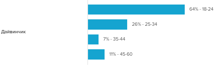 У пользователей 18−24 лет популярен сервис «Дайвинчик» (64% из них знают его). Представители других возрастных категорий называли этот сайт реже (25−34 — 26%, 35−44 — 7%, 45−60 — 11%). Молодежь 18−24 лет чаще дает ссылку на свою страницу в соцсетях при знакомстве через дейтинговый сервис.