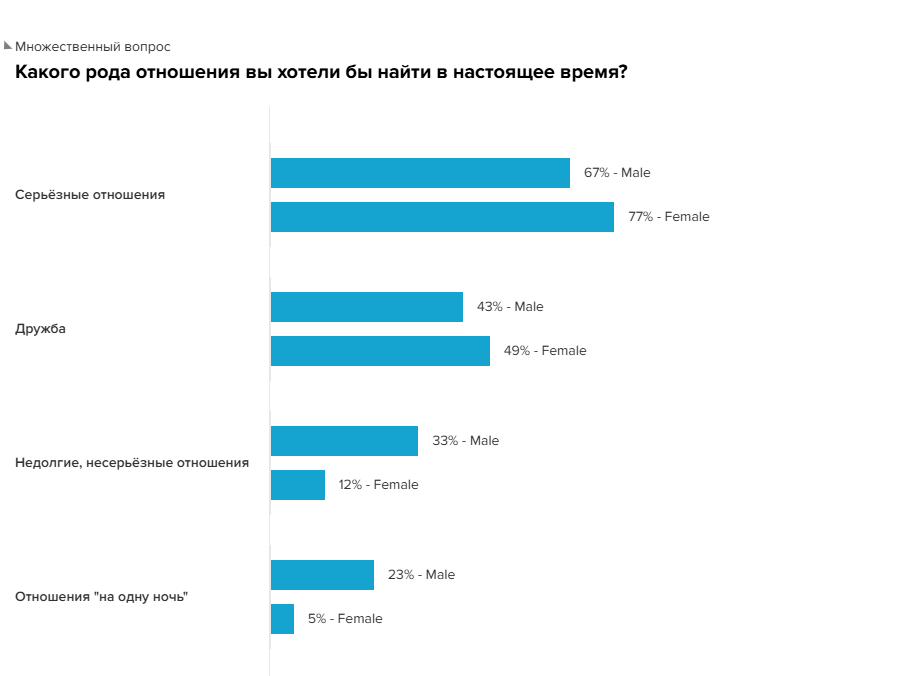 72% россиян, открытых к знакомствам, ищут серьезные отношения. Четверть готовы к несерьезным отношениям, 15% не отрицают вариант знакомств «на одну ночь». Чаще всего знакомятся через друзей (так знакомились когда-либо 58% респондентов), на работе (51%), в соцсетях (49%) и на сайтах знакомств (48%). Об этом говорится в исследовании Tiburon Research, которое есть в распоряжении Sostav.