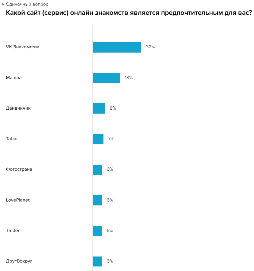 В топ-5 самых популярных сайтов знакомств в России вошли «VK Знакомства» (сервис назвали 32% опрошенных), Mamba (18%), «Дайвинчик» (8%), Tabor (7%), «Фотострана» (6%) и LovePlanet (6%).