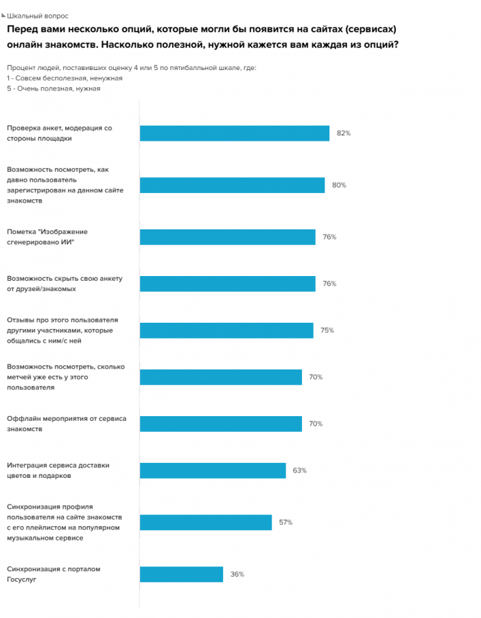 82% пользователей не хватает на сайтах знакомств проверки анкет и модерации со стороны платформ. 80% хотели бы видеть, как давно пользователь зарегистрирован на сайте. В числе других нужных фич — маркировка о генерации изображения искусственным интеллектом, отзывы про пользователя от других участников, возможность посмотреть количество «мэтчей» у человека и скрыть свою анкету от знакомых.