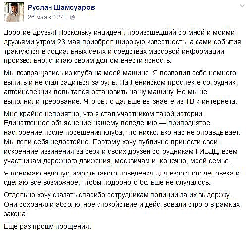 Примечательно, что все происходящее транслировалось в Periscope одним из участников гонки, Русланом Шамсуаровым. Он оказался человеком со связями - сыном старшего вице-президента «ЛУКОЙЛа» по добыче нефти и газа. На видео он сравнивает погоню с GTA и рассказывает о поведении полицейских: «Денег не просят, оформляют. Тут за бабки нельзя решить вопрос, и это неправильно». Позже Шамсуаров написал в Facebook, что единственным объяснением их поведения было «приподнятое настроение после посещения клуба».