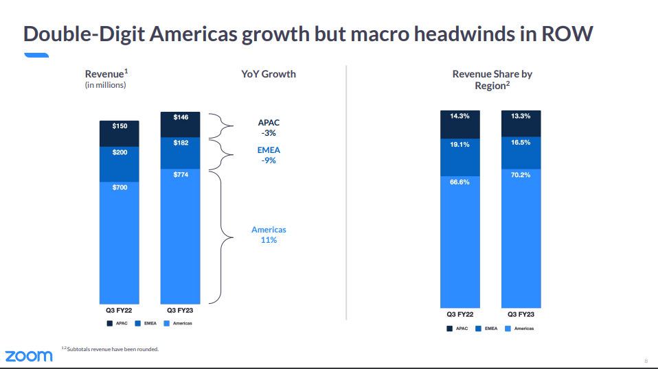 Снижение выручки Zoom также произошло в Азиатско-Тихоокеанском регионе (APAC) — показатель уменьшился на 3% в годовом выражении до $146 млн. При этом в Американском регионе (куда входят страны Северной и Южной Америки) выручка выросла на 11%, достигнув $774 млн. Общая выручка Zoom увеличилась на 5% год к году, до $1,1 млрд, чистая прибыль компании составила $323,2 млн.