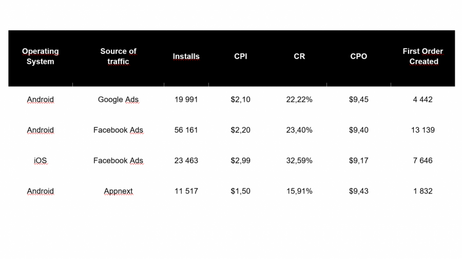Опираясь на статистику, можно, сказать, что мы не только смогли успешно масштабировать результаты первых трёх месяцев работы, но и привлекли исключительно целевую аудиторию. Об этом свидетельствуют высокие показатели CR в первый заказ и количество повторных заказов, сделанных новыми пользователями. В среднем каждый из них совершил после первого заказа еще девять. Если говорить на языке денег, то ставка CPA для каждого совершенного заказа с помощью приложения MrSpeedy равнялась $0,79.