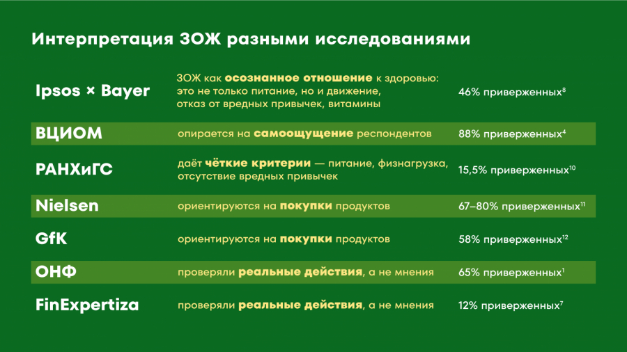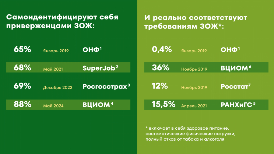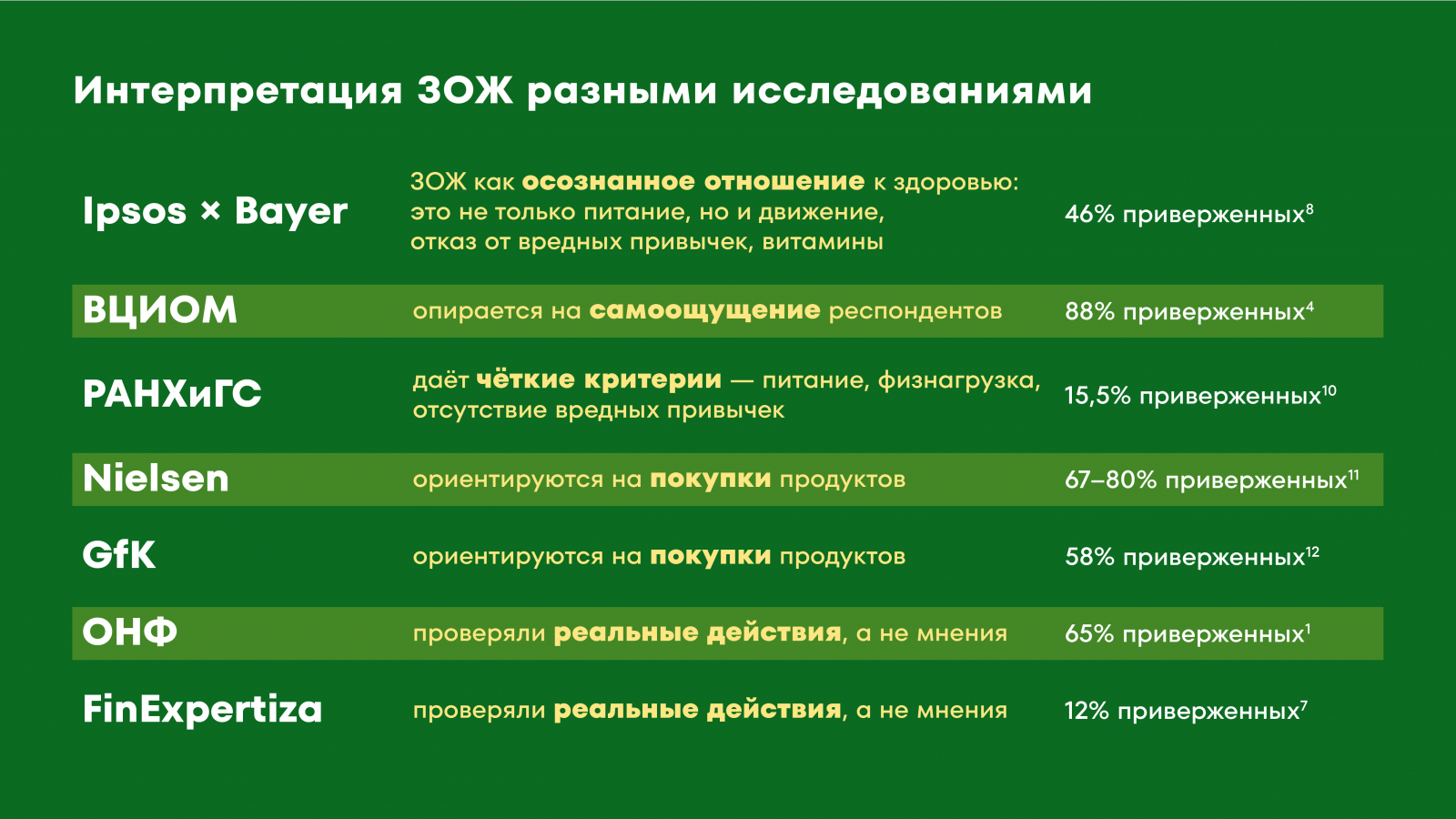 Следует отметить, что маркетинговые (Ipsos x Bayer, GfK, Nielsen) и социальные (ВЦИОМ, ФОМ, Ipsos Global Trends) опросы дают более высокую цифру по ЗОЖ, чем социологические (РАНХиГС, ОНФ, Росстат) с практическими критериями. То есть цифры зависят от определения ЗОЖ: чем строже критерии — тем меньше ЗОЖников.