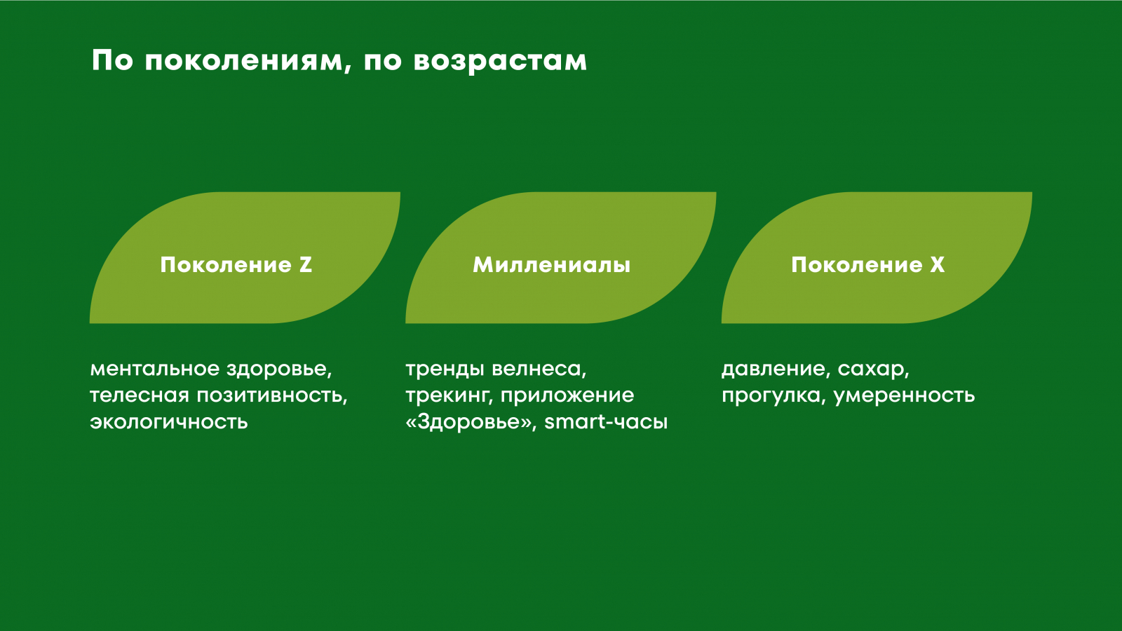 ЗОЖ — это не один универсальный стиль жизни, а десятки сценариев: от перфекциониста с трекером до гедониста на прогулке. Теперь, когда ЗОЖ не тренд, а культурный код, бренду стоит адаптировать коммуникации под разные смыслы, в зависимости от мировоззрения, психотипа, возрастной группы, прочее.