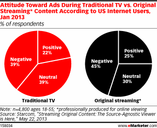 В отчете eMarketer говорится, что нейтральных отзывов о ТВ-рекламе 39%, о видеорекламе – 30%. Положительно отзываются 22% и 25% зрителей соответственно, отрицательно – 39% и 45%. Статистика свидетельствует, что маркетологам, создателям интернет-контента и провайдерам не нужно кардинально менять рекламную модель.
