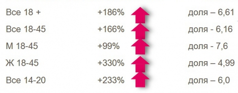 Как видно, наибольший процент прироста телесмотрения во время Олимпиады в Лондоне на канале Россия 2 происходил за счет женской аудитории. В абсолютном выражении рост доли составил около 4.