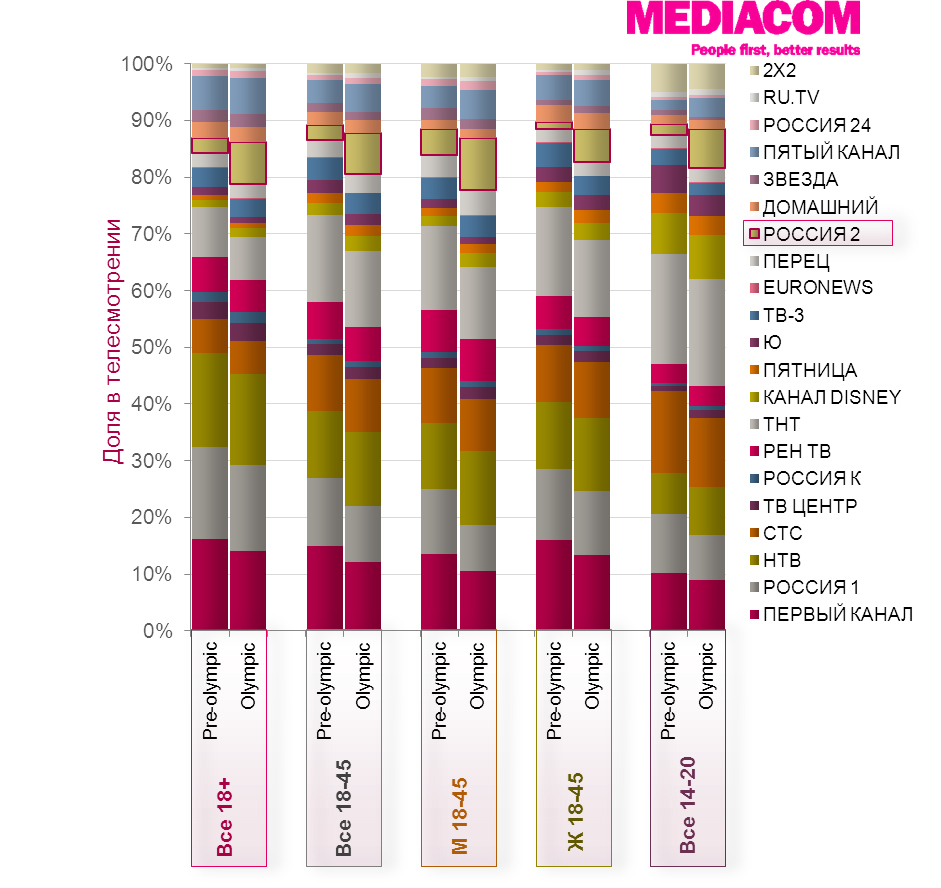 С каких каналов произошел отток зрителей в пользу канала Россия 2? В первую очередь, очевидно падение долей смотрения ведущих национальных телеканалов – Первого (процентное изменение телесмотрения от предолимпийского показывает от 11% до 20% в разных аудиториях), Россия 1 (от 7% до 30%) и канала ТНТ (от 11% до 45%, кроме молодежной аудитории).