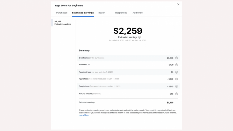 Издание The Verge опубликовало пример нового интерфейса. В нем указан заработок и отчисления инструктора по йоге от курсов для начинающих. Более чем 1 тыс. учеников заплатили $3,3 тыс. и оформили 6 возвратов на $18. Инструктор заплатил налог $420, помимо этого отчисления Facebook составили $0, Apple — $360, Google — $240. Всего он заработал около $2,3 тыс.