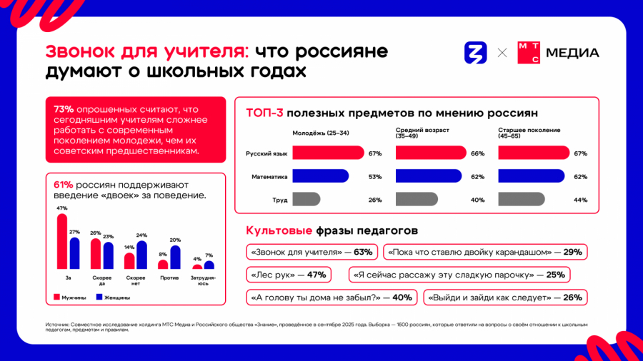 В преддверии Дня учителя, который отмечается в России сегодня, 5 октября, холдинг МТС Медиа и Российское общество «Знание» опросили 1600 россиян об их отношении к школьным педагогам, предметам и правилам.