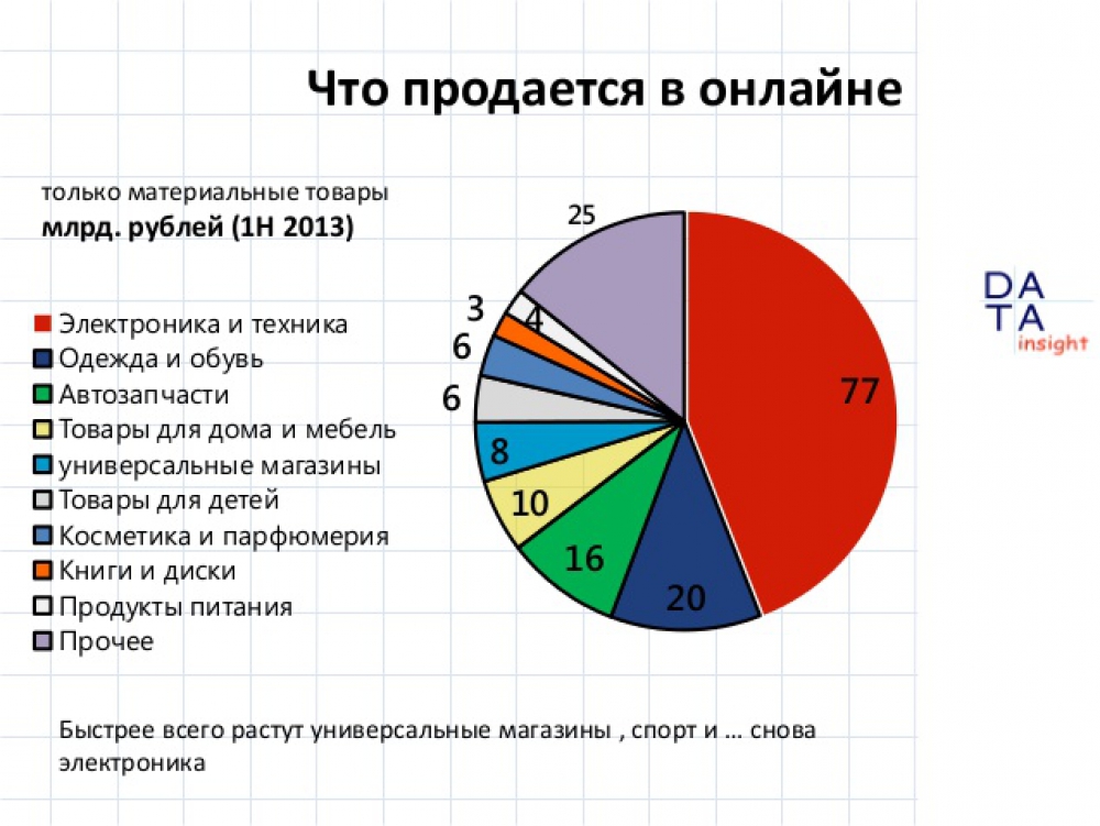 E-coomerce продолжается. Рынок материальных товаров в первом полугодии 2013 года составил 160 млрд рублей (рост 29%). Происходит перелом темпов роста. Раньше темпы роста снижались, теперь - увеличиваются. 28 млн онлайн-покупателей, а число покупателей растет быстрее количества покупок.