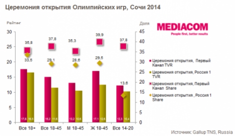Рейтинги церемонии открытия Олимпиады в Сочи оказались сопоставимы с Новогодним обращением президента Путина. Почти 70% аудитории было сосредоточенно на двух каналах, транслировавших церемонию. Открытие спортивного первенства стало самым рейтинговым событием года, обогнав финал шоу «Голос», подсчитали эксперты агентства Mediacom.