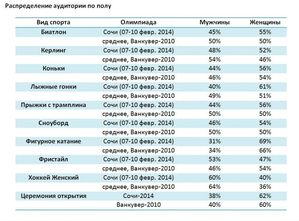Доля молодой и женской аудиторий выросла в трансляциях почти всех видов спорта Сочи-2014