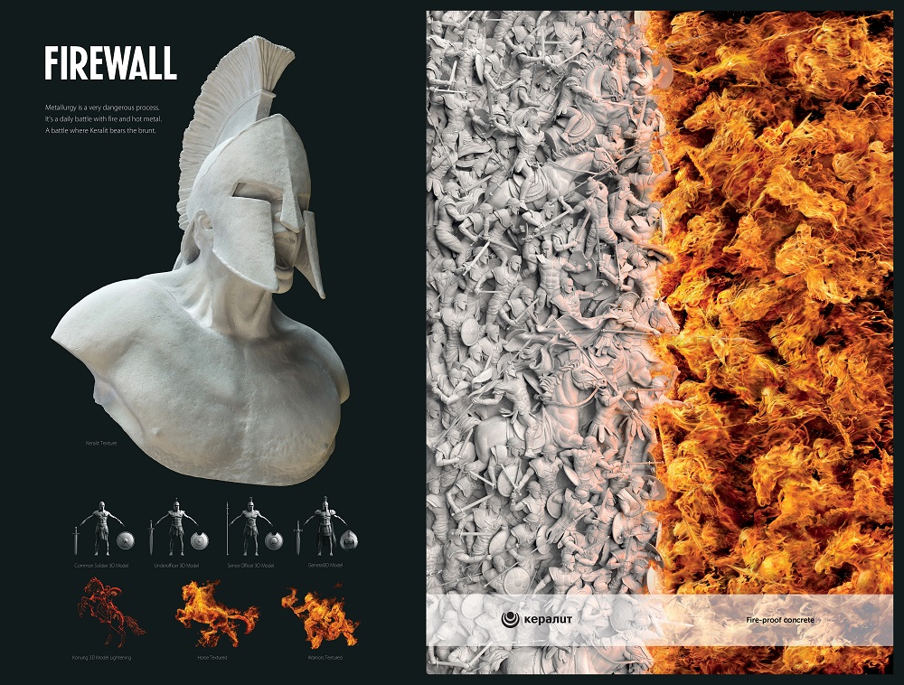 Агентство Friends Moscow в 2014 году разработало принт для компании «Кералит», производящей огнеупорные материалы. Креаторы нашли оригинальный образ для решения этой задачи: борьба Огня и Кералита - битва, которая разворачивается каждый день; схватка, в которой нет ни победителей, ни проигравших; сражение, в котором рождается металл.