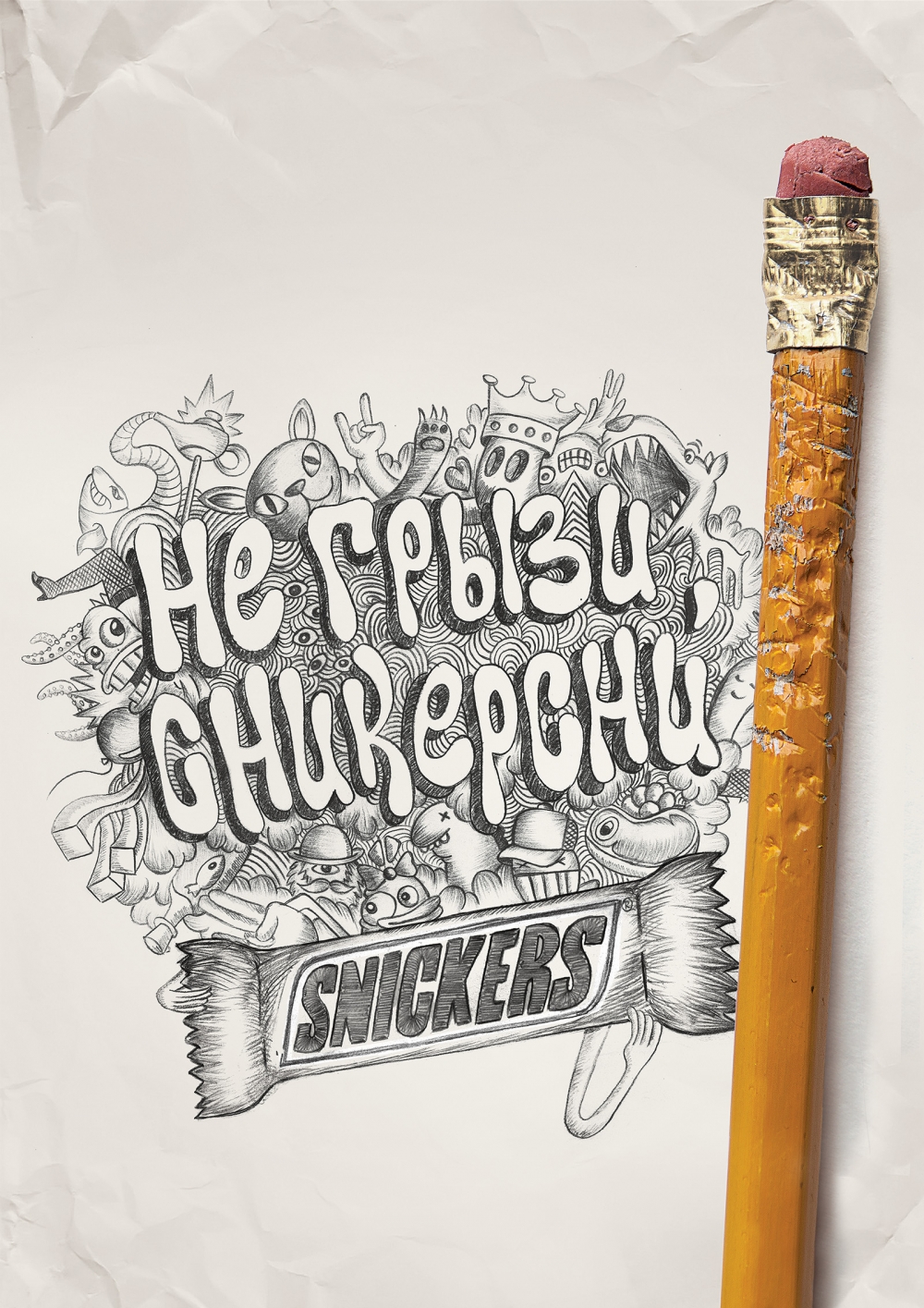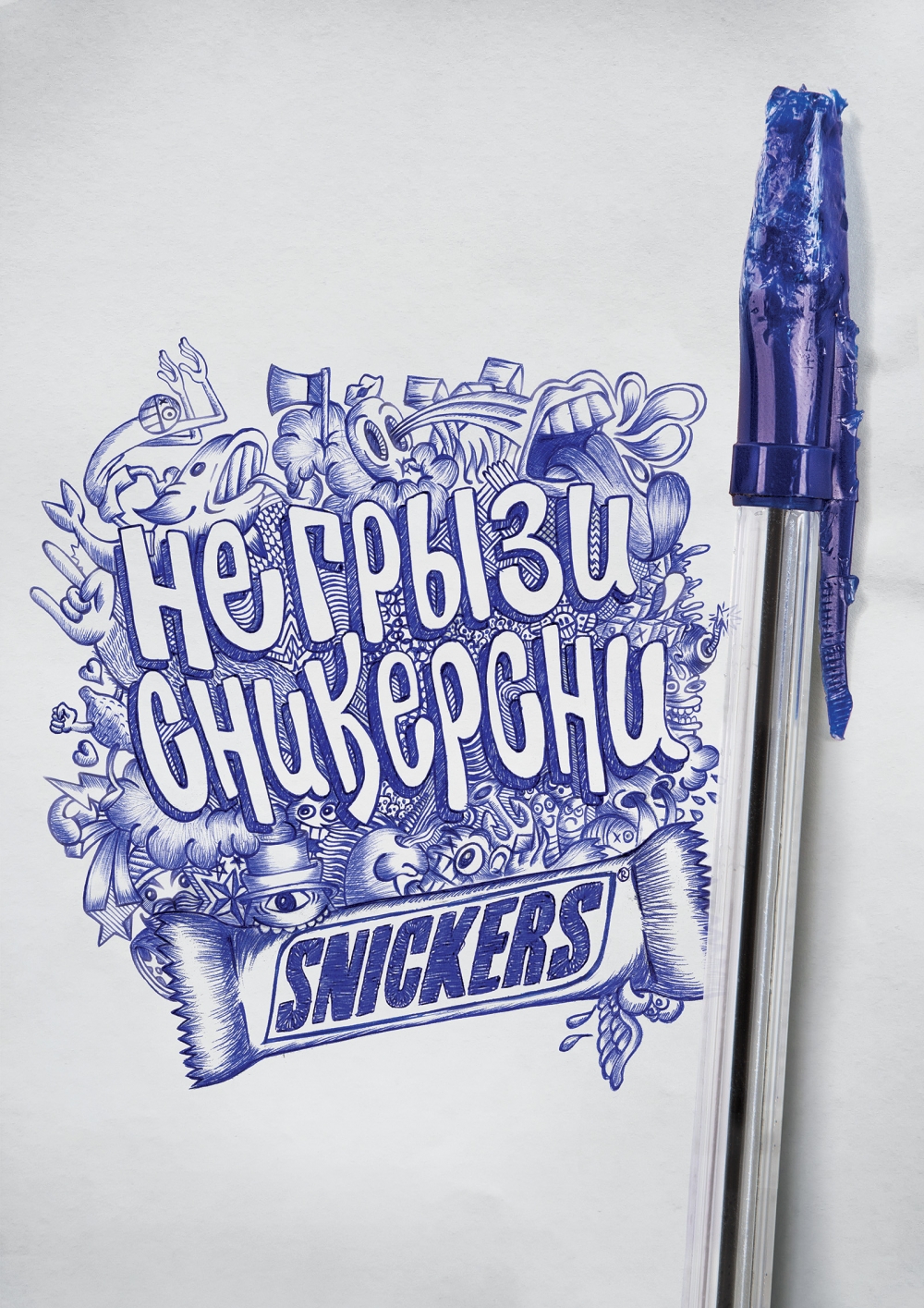Агентство BBDO Moscow разработало для бренда шоколадного батончика Snickers серию принтов, призывающую не подменять прием пищи разгрызанием карандашей и ручек.