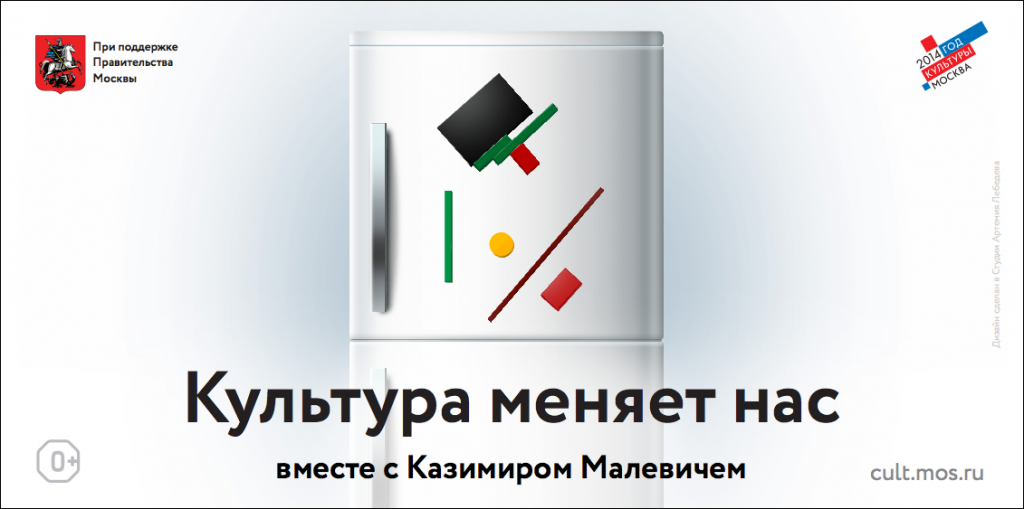Новое прочтение получили такие шедевры, как «Композиция» Мондриана, «Виолончель и шахматная доска» Гриса, «Супрематическая композиция» Малевича, «Мыслитель» Родена, «Дискобол» Мирона, дом Мельникова в Кривоарбатском переулке. Слоган кампании - «Культура меняет нас».