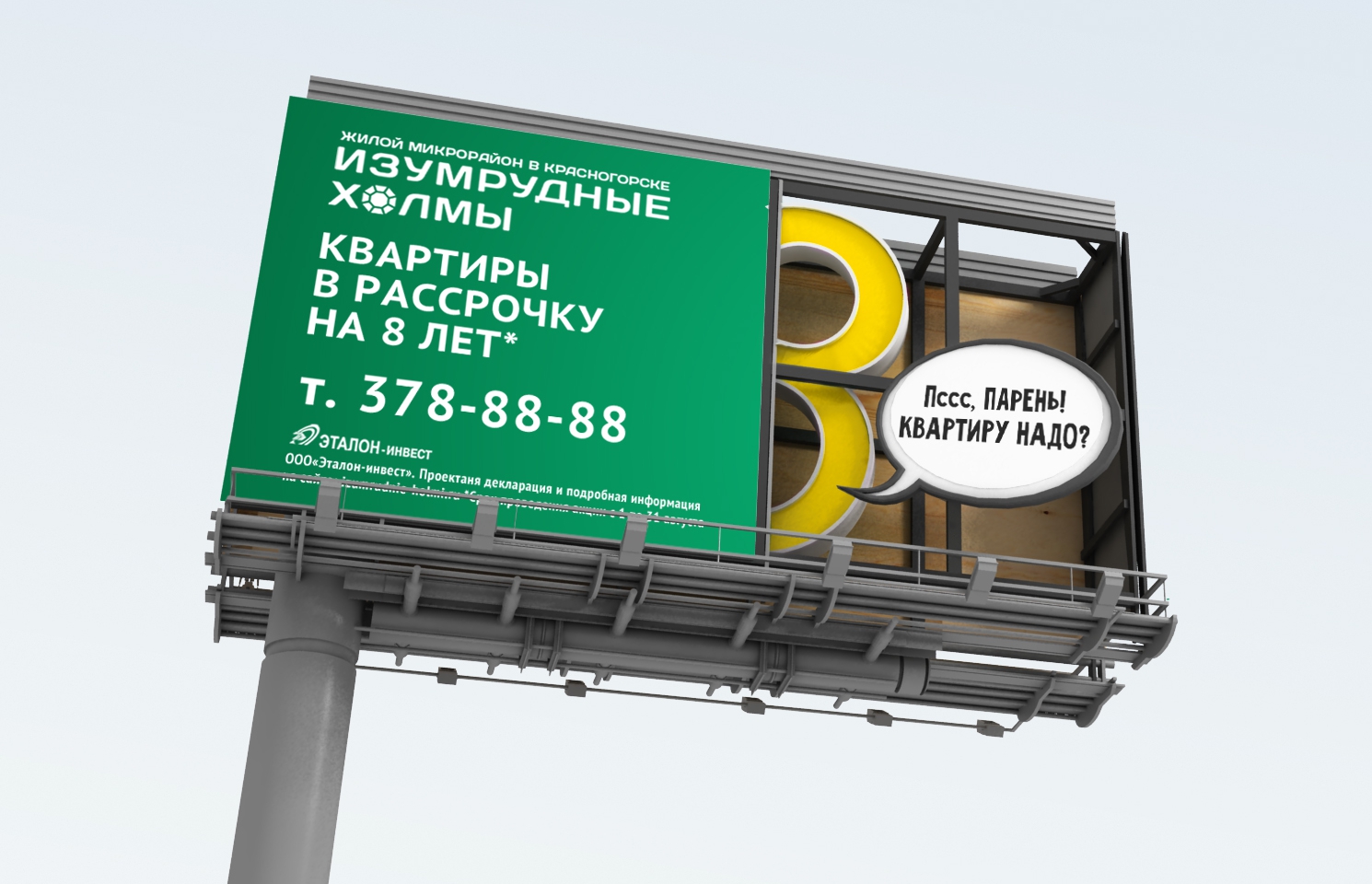 Агентство StreetArt разработало в 2014 году необычную аутдор-кампанию для жилого комплекса «Изумрудные холмы» (ГК «Эталон»). В основу оригинальной кампании «Большая Восьмёрка» легли всем известные ироничные сетевые мемы «Пссс… Парень!».