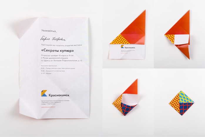 Московская студия Besapiens в 2014 году разработала айдентику города Краснокамск Пермской области. Оригами - идея визуальной айдентики города. Принцип, который позволяет получить бесконечное количество вариаций знака и стилеобразующей графики для обозначения любой городской инициативы.