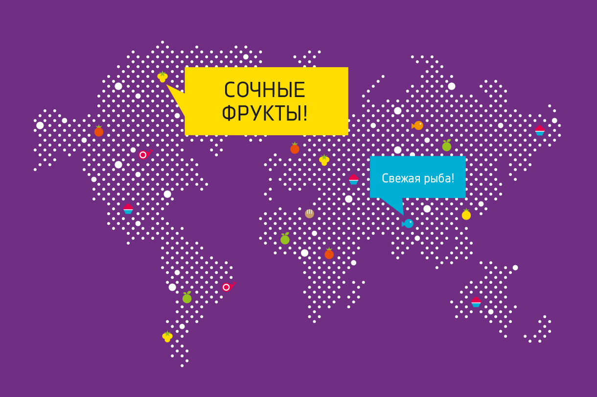 Основной декоративный элемент стиля представляет собой географическую карту с изображением континентов, которая напрямую связана с названием бренда. Города на карте превратились в продукты, которые могут «общаться» с потребителем. Цвета бренда также изменились, строгий фиолетовый был дополнен оптимистичным голубым в сочетании с желтым и акционным маджентовым цветом.