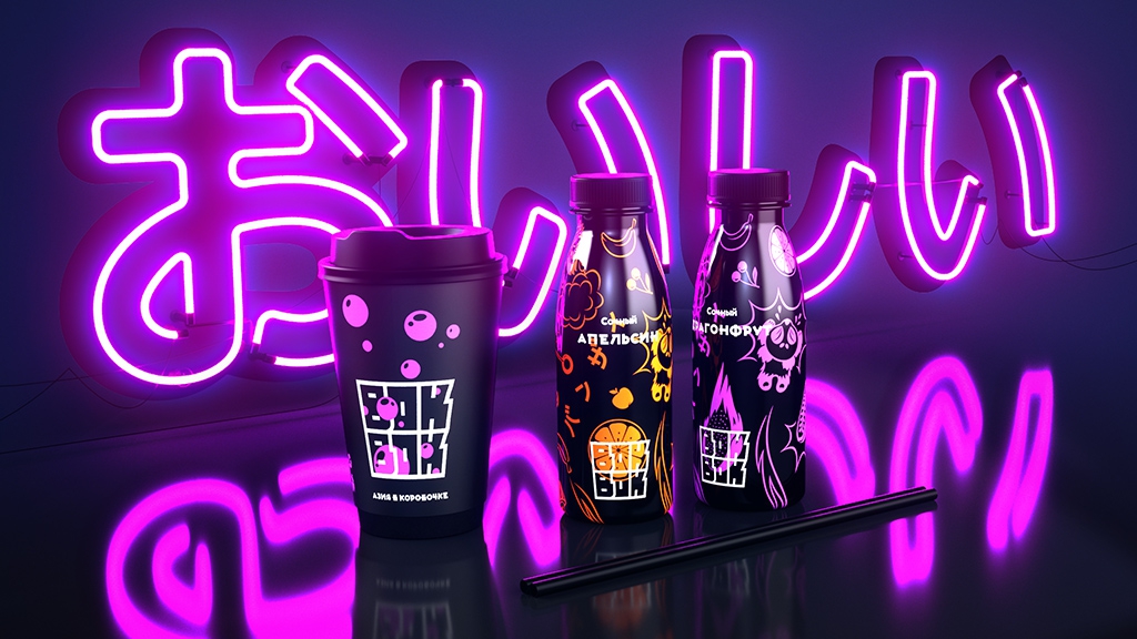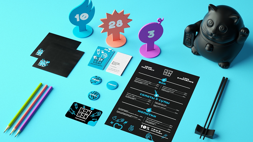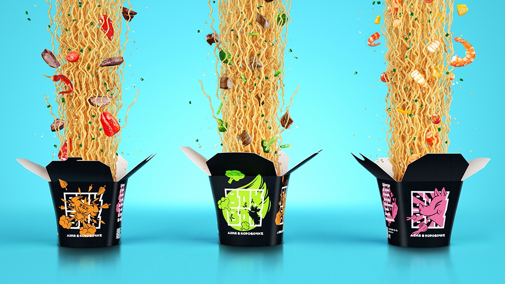 Агентство ODINMAY в 2014 году разработало бренд ресторанов азиатской кухни «Азия в коробочке». Логотип (упакованное в коробочку для лапши название) позволяет сразу безошибочно определить категорию: перед нами - лапшичная. Стиль - современная Азия с традиционным вкусом. Иллюстрации передают настроение бренда: ярко, броско, кавайно.