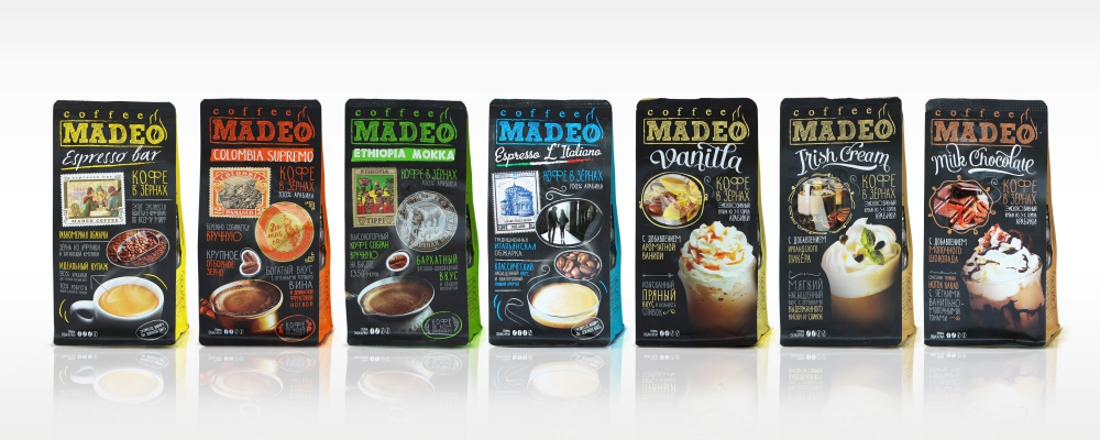 Агентство Getbrand представило в 2014 году новый дизайн упаковки для кофейного бренда Madeo. В рэнже Madeo 3 линейки и семь сортов кофе, каждый – со своей историей. Упаковка каждого из сортов рассказывает о происхождении, рекомендациях по приготовлению и обжарке кофе и даже описывает ожидаемые вкусовые ощущения от данного сорта.