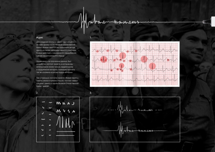 Логотип и фирменный стиль заслуживают особого внимания. Авторы проекта записали кардиограмму сердцебиения одного из авторов писем - непосредственного участника боевых действий. Рисунок кардиограммы и стал основой для графического знака.