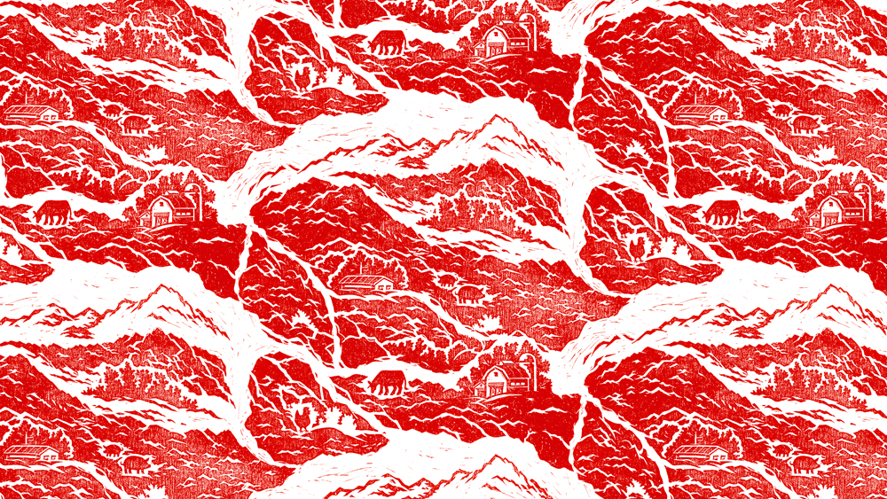 При ближайшем рассмотрении в мясных волокнах угадываются силуэты ферм, деревушек, Уральских гор и пасущегося у их подножия скота. Сложный многоплановый фон дополняется лаконичной информационной этикеткой, удобно масштабируемой на разные типы упаковок внутри торговой марки.